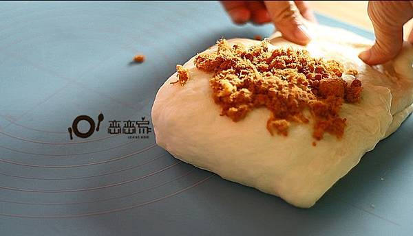 5。先將一邊鋪上蔥花,中間再依序鋪上約70g的肉鬆,依序折成長條形