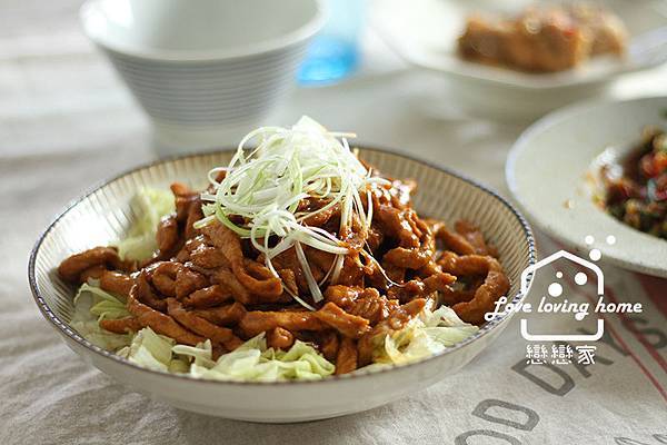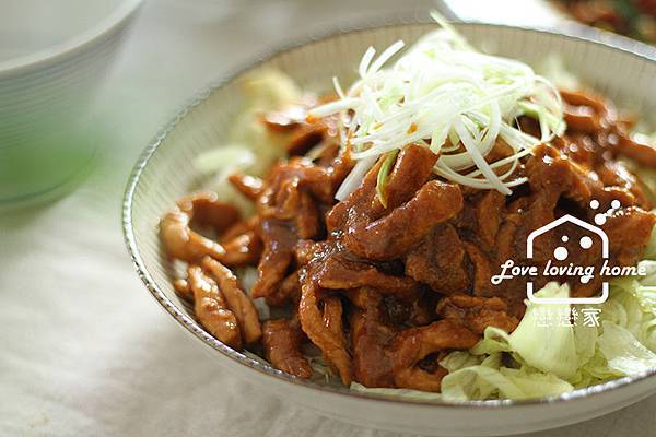 6.將肉絲下鍋和醬汁一起拌勻,待醬汁都沾附在肉絲上即可起鍋,放上歩驟一的蔥絲即完成。