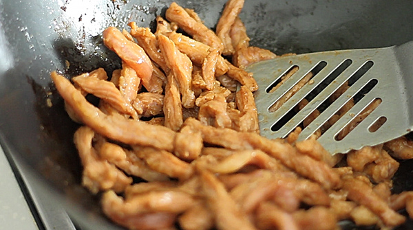 4.將肉絲下鍋,炒至半生熟即可起鍋備用
